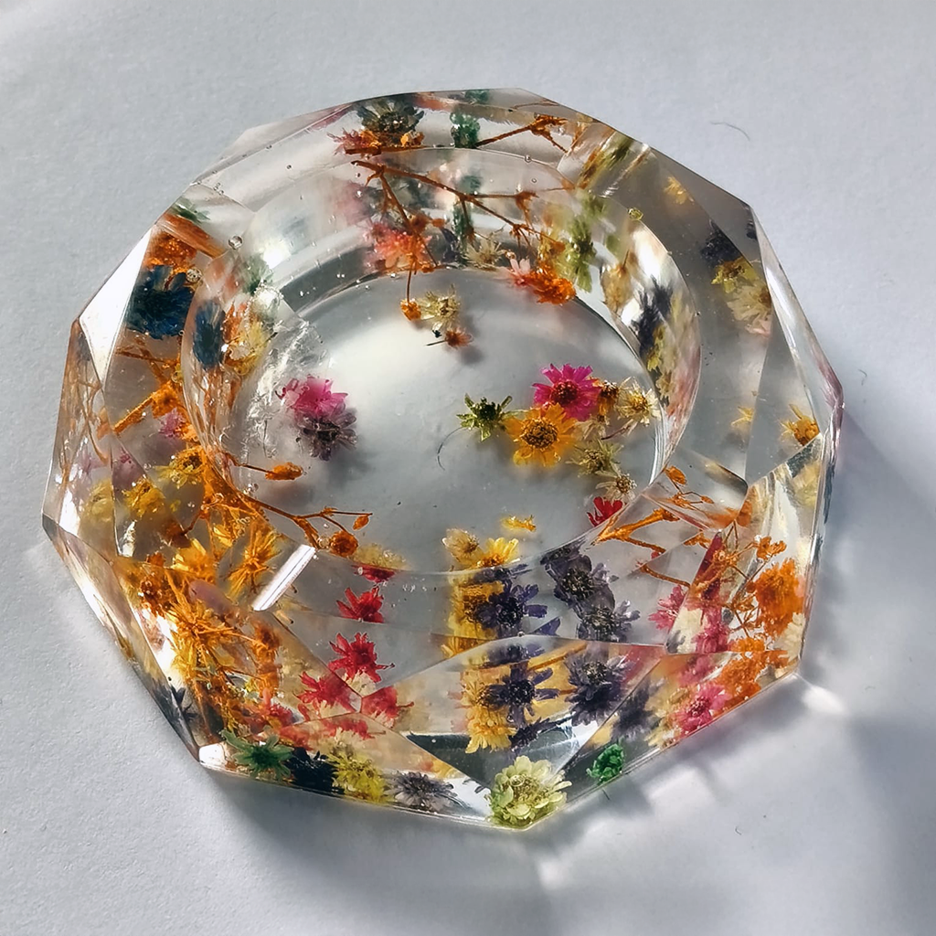 Hay objetos que tienen la capacidad mágica de encerrar todo un paisaje en la palma de tu mano. Este cenicero, con su elegante corte facetado, es un caleidoscopio de naturaleza viva que celebra la diversidad y el color de la estación más alegre del año.