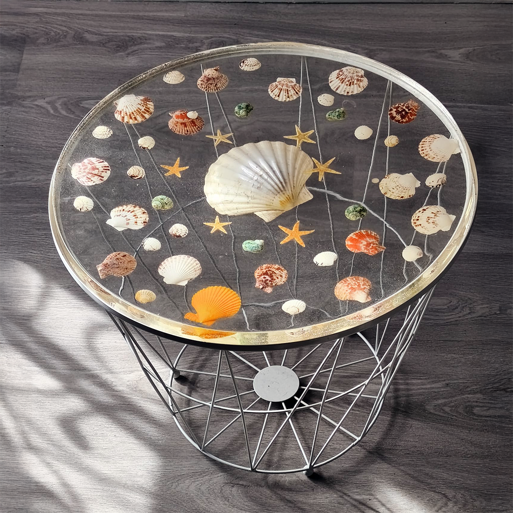 Su superficie de resina cristalina guarda en su interior una delicada composición de conchas naturales y estrellas marinas, suspendidas como recuerdos flotando en el tiempo. Cada detalle evoca la calma del océano Índico, la luz del sol sobre el agua y la serenidad de las playas infinitas.