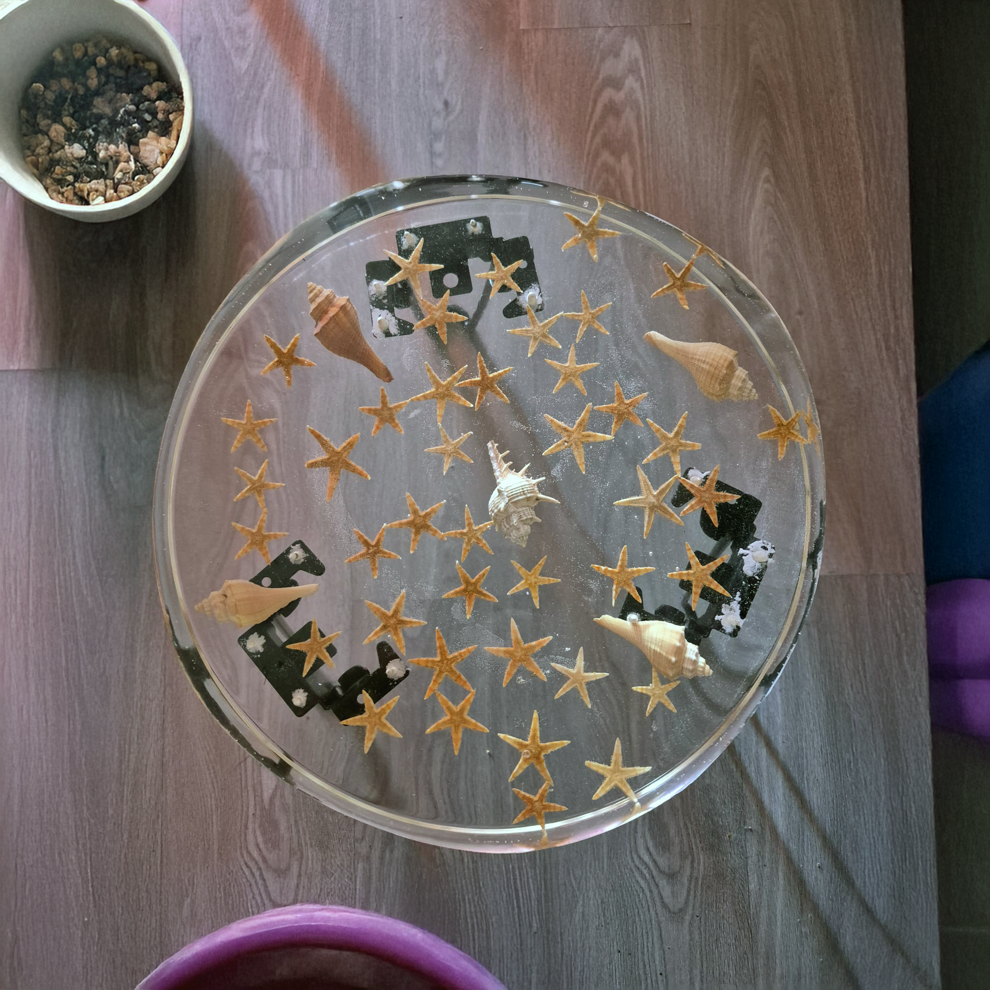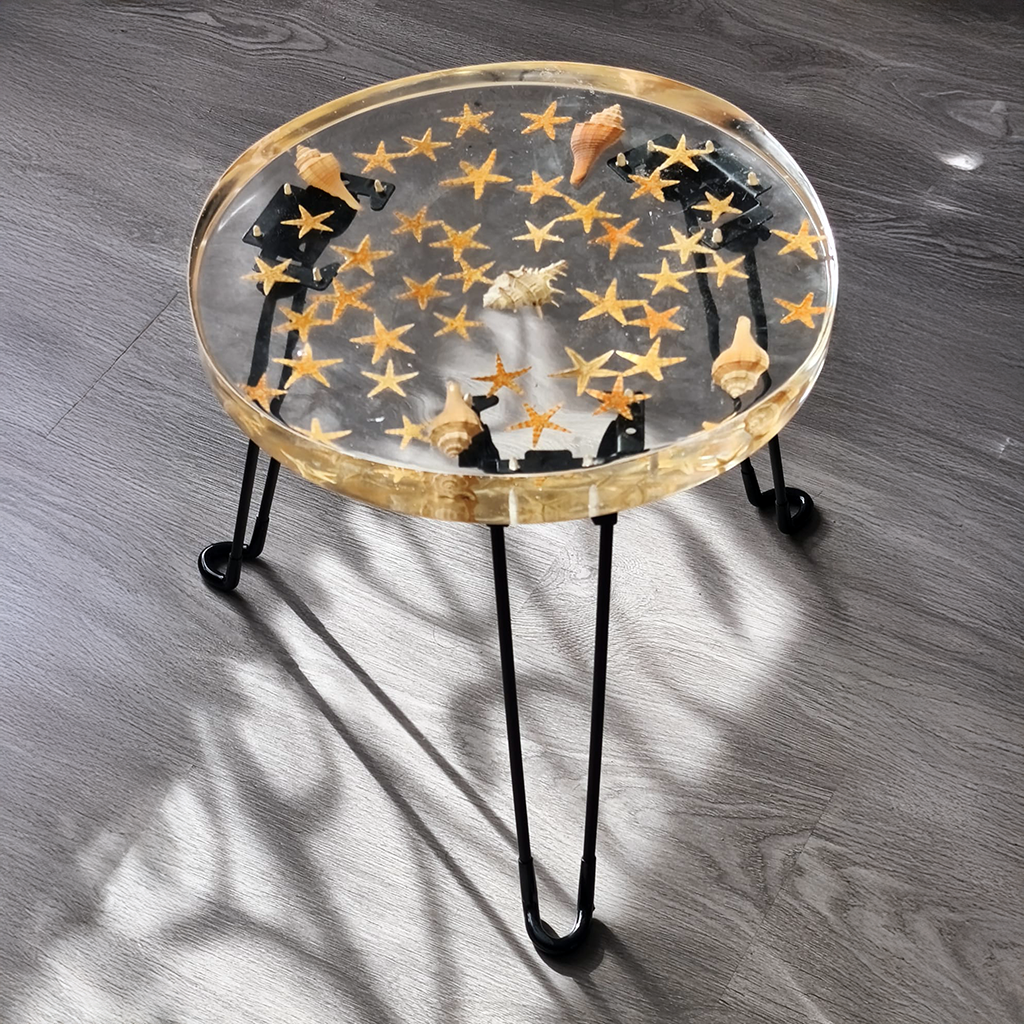 Lleva la serenidad del océano a tu hogar con esta mesa que captura la magia de un paseo por la playa al atardecer. Como si el tiempo se hubiera detenido en la orilla, esta pieza preserva bajo una superficie cristalina un jardín secreto de estrellas de mar y caracolas.